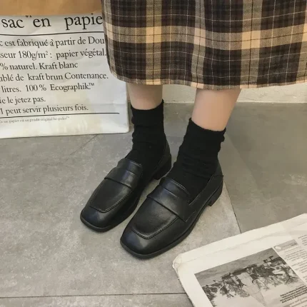 Women Vintage British Style PU Square Toe Solid Color Fashion PU Loafers