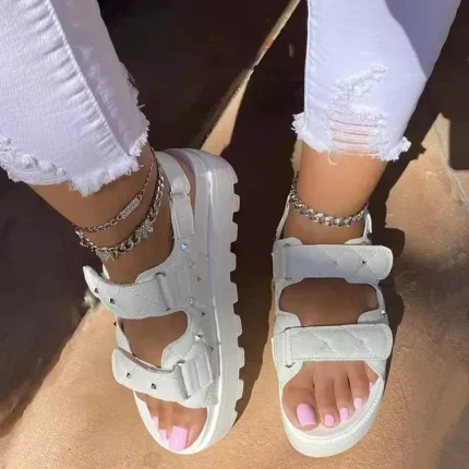 Women Casual Round Open Toe Double Buckle Design Flat Sandals